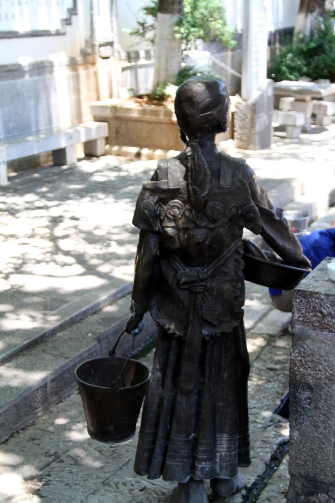 到了秋天,天地间到处是“空山新雨后,天气晚来秋”的原始质感,还有“竹喧归浣女,莲动下渔舟”的立体感,古城三眼井旁的雕像,仿佛将诗意具体化了。看那“阿勒邱”,集勤劳和智慧于一身,她们“肩挑日月”,细数着日子,只要得空,还不忘将布满尘埃的衣物浣洗。雕像里,衣物、水盆、水桶、洗衣板,还有“阿勒邱”的头饰、腰带等,共同构成了时间的细节和空间的内容,因此,当时间与时间重叠,空间与空间纠缠,便是暂时卸下一身疲惫,尽情享受丽江时光的时候,你看,游客朋友见到雕像,有些拍照留存,有些干脆在雕像旁坐下,仿佛也要将自己那些年美好的部分在记忆中短暂重组一遍。